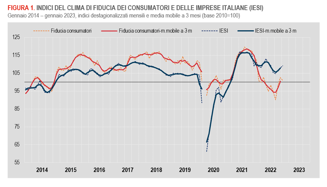 A gennaio 2023 torna a contrarsi la fiducia dei consumatori, con l’indice composito Istat che scende da 102,5 a 100,9. Continua invece a crescere, per il terzo mese consecutivo, la fiducia delle imprese, dove l’indice registra una crescita da 107,9 a 109,1, spinto dal comparto dei servizi e dell’industria.