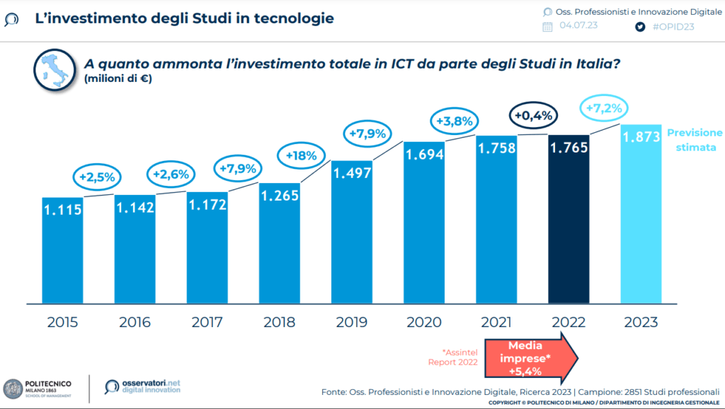 Nel 2022 i professionisti italiani (avvocati, commercialisti e consulenti del lavoro) hanno investito complessivamente 1,765 miliardi di euro in tecnologie digitali. La spesa, in linea con il valore del 2021 (+0,4%) è stata condizionata dal difficile contesto economico, che ha frenato gli investimenti nel biennio 2021-2022.