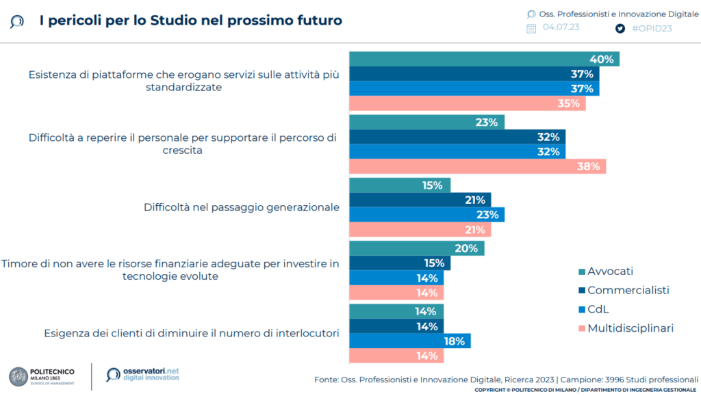 Il secondo futuro pericolo per i professionisti è non riuscire ad assumere personale per supportare il percorso di crescita dello studio, il terzo non riuscire a realizzare il passaggio generazionale.