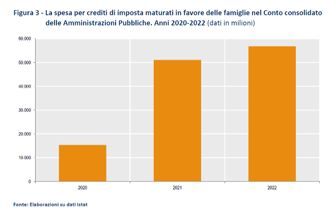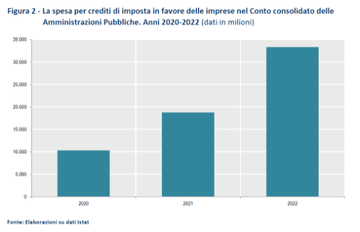 Ciò premesso, la spesa per crediti d’imposta “pagabili” riconosciuti a favore delle imprese è cresciuta, secondo i dati Istat, quasi esponenzialmente nel triennio 2020-2022, raggiungendo oltre 33 miliardi di euro nel 2022 rispetto ai 18,8 miliardi di euro del 2021.