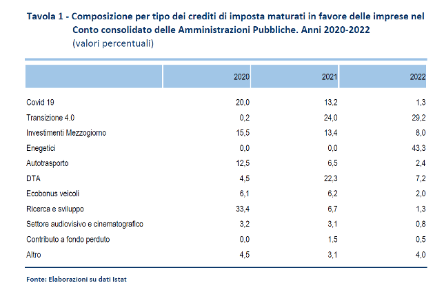 Molto interessante è l’analisi della composizione della spesa pubblica per i crediti d’imposta rivolti alle imprese nel triennio 2020-2022: