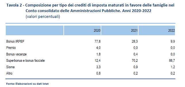 • nel 2022 Superbonus e Bonus facciate hanno raggiunto quasi l’88,7%, su un totale di crediti destinati alle famiglie di circa 57 miliardi di euro, mentre nello stesso anno il “bonus IRPEF” è stato ridimensionato al 9,9% per effetto della ridefinizione del sistema delle detrazioni.