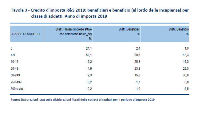 La distribuzione del credito d’imposta R&S dell’anno 2019 per dimensione delle imprese (numero di addetti) rivela una netta concentrazione della misura tra le Pmi: