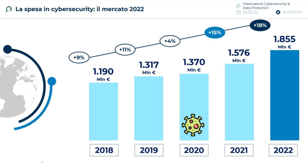 Intanto, il mercato della cybersecurity, dopo la crescita del 15% del 2021, conosce un’ulteriore spinta del 18% nel 2022, dettata dalla ripresa degli investimenti delle organizzazioni e da una progressiva presa di coscienza sulle minacce, raggiungendo il valore di 1,8 miliardi di euro. Una crescita sostenuta in buona parte dalle medie imprese, che iniziano finalmente a introdurre azioni concrete in materia di cybersicurezza. Suddividendo il mercato nelle diverse componenti di spesa, il 50% è dedicato a servizi, in crescita rispetto allo scorso anno, e l’altra metà a soluzioni di cybersecurity.