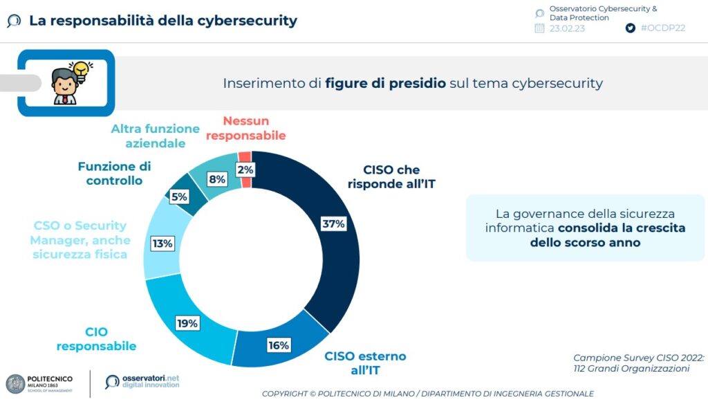 Si potenzia la governance della sicurezza informatica nelle organizzazioni italiane. Nel 53% delle imprese oggi è presente un Chief Information Security Officer (CISO) formalizzato, che si colloca principalmente all’interno della Direzione IT (37%).