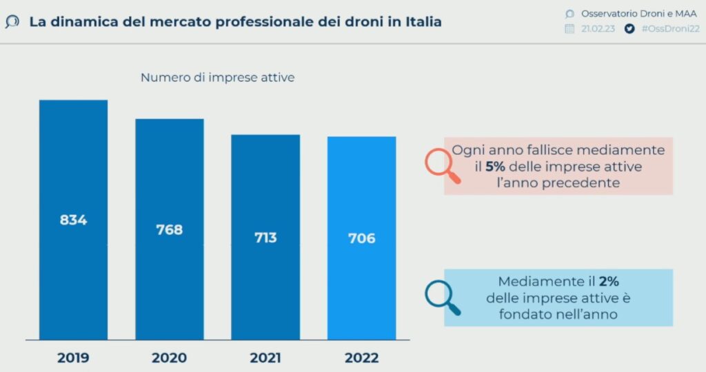 Le imprese del settore in Italia sono 706, (in lieve calo rispetto alle 713 del 2021), mentre si contano quasi 60mila droni registrati sul portale d-flight dal 2020 a oggi (13mila nel 2022), di cui il 92% per droni a uso ricreativo e solo l’8% per droni a uso professionale in imprese e PA.
