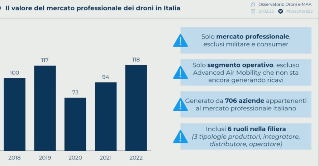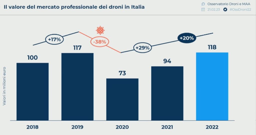 Un valore del mercato italiano che arriva a 118 milioni di euro nell’ultimo anno, con una crescita del 20% rispetto al 2021. Sono i principali numeri che indicano il trend dei droni in Italia e il loro mercato professionale, che non comprende l’uso privato e quello militare.
