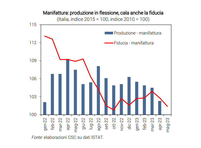 Le aspettative delle imprese industriali, infatti, peggiorano in aprile e maggio, rilevando un rallentamento nelle prospettive di domanda. A maggio flettono anche quelle dei servizi, mentre rimane stabile la fiducia delle famiglie, ma ancora molto sotto i livelli pre-pandemici.