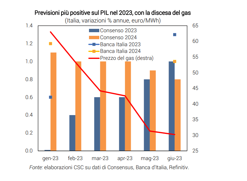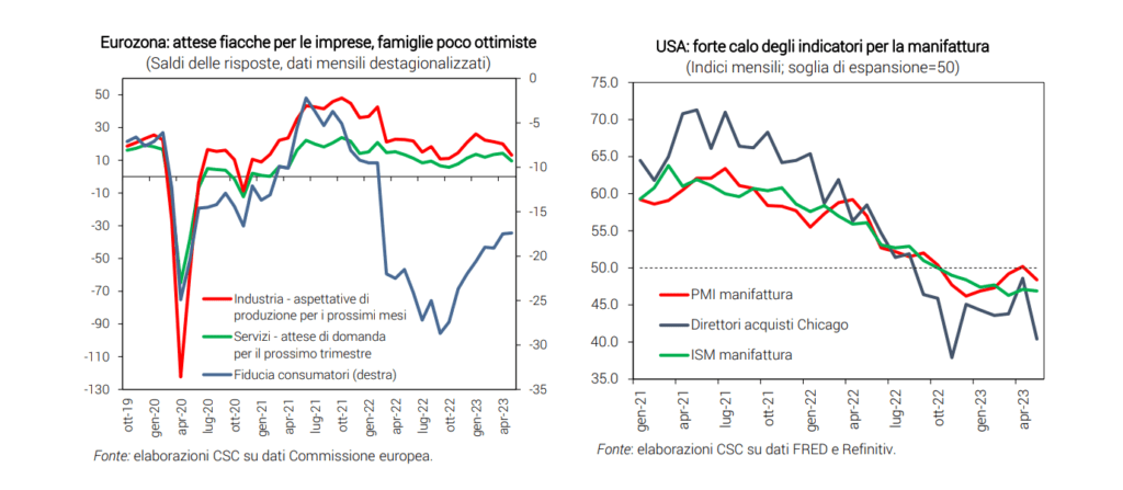 Si continuano ad accumulare segnali di indebolimento, specie per l’industria e le costruzioni, sebbene il +0,6% del PIL italiano nel 1° trimestre frutti una crescita già acquisita di +0,9% nel 2023.