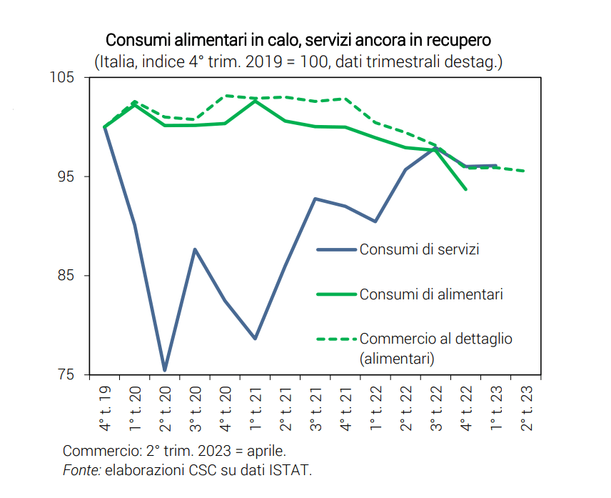 A inizio 2023 la quota spesa per servizi (51%) ha superato di nuovo quella dei beni (49%). Si prevede che nel 2023 i consumi alimentari risentiranno ancora delle tensioni sui prezzi.
