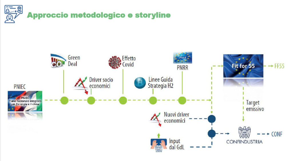 Rispetto allo scenario FF55, il tavolo tecnico Confindustria ha proposto di aggiornare alcuni driver economici (proiezioni di PIL e VA settoriali, ma anche prezzo del gas e dei permessi di emissione di CO2 per il settore ETS) e inserire vincoli da input tecnici, di policy, piani e strategie industriali derivanti dalle discussioni del Tavolo di lavoro a cui hanno partecipato le principali Associazioni di Confindustria. Questi ultimi indirizzi sono stati, ove necessario, considerati prioritari rispetto ad alcuni sottotarget del pacchetto FF55.