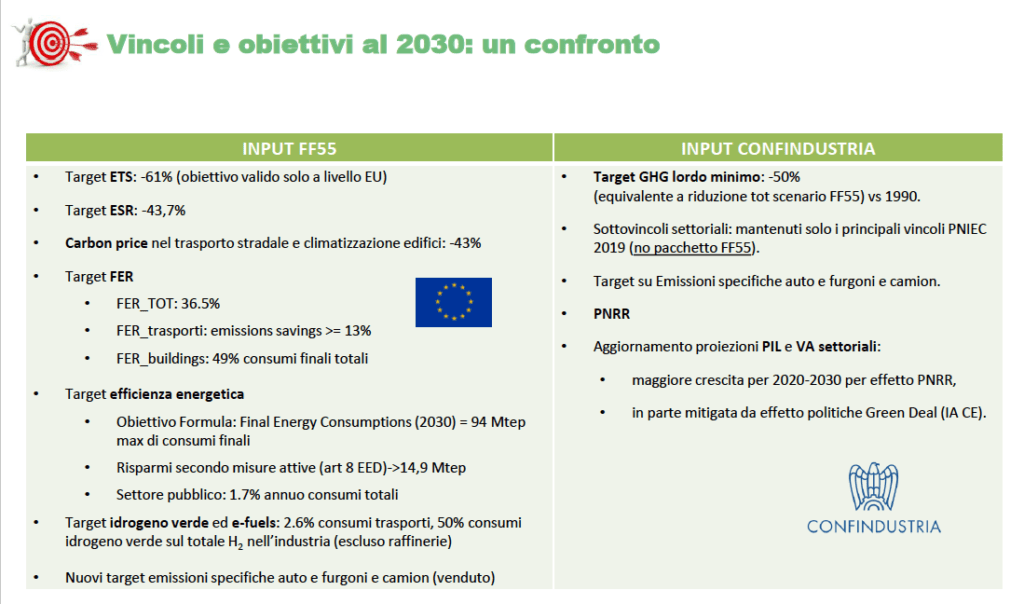 Nello scenario FF55 sono stati inseriti tutti i vincoli e target previsti nel pacchetto Fit for 55, mentre lo scenario Confindustria è stato costruito mantenendo solo un target di riduzione generale delle emissioni, senza vincoli settoriali, pari al valore ottenuto dalla combinazione delle proposte di Direttive dello scenario FF55 (come da tabella sotto).