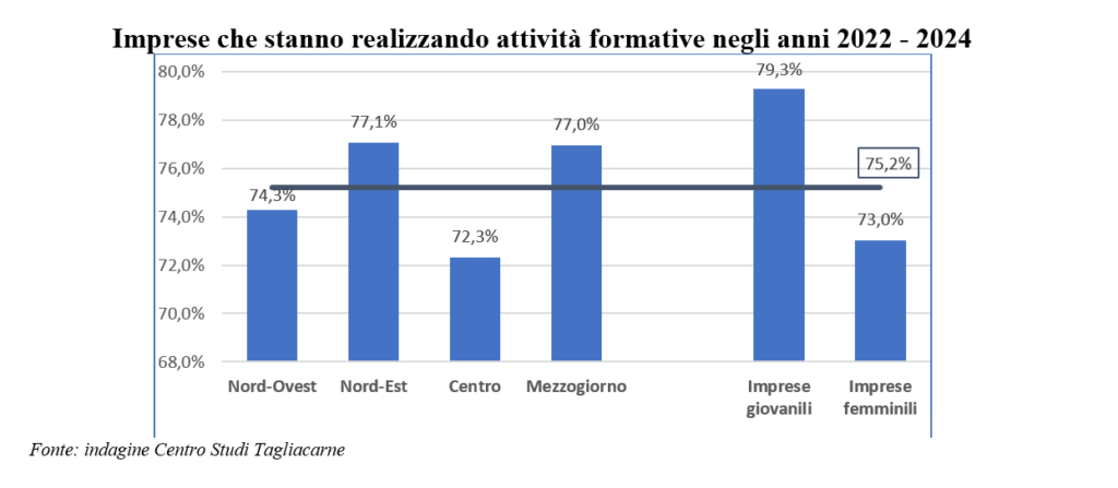 Tuttavia, nel triennio 2022-2024 è diminuita la quota delle imprese che puntano a formare le proprie risorse umane rispetto al triennio pre-Covid (75,2% contro il 78,6% del 2017-2019).
