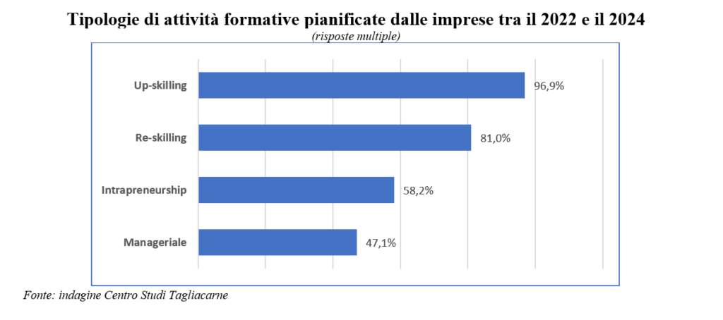 Nel complesso, il 75,2% delle imprese realizzerà almeno un’attività di formazione tra il 2022 e il 2024. Una quota che sale al 79,3% nel caso delle imprese guidate da giovani.