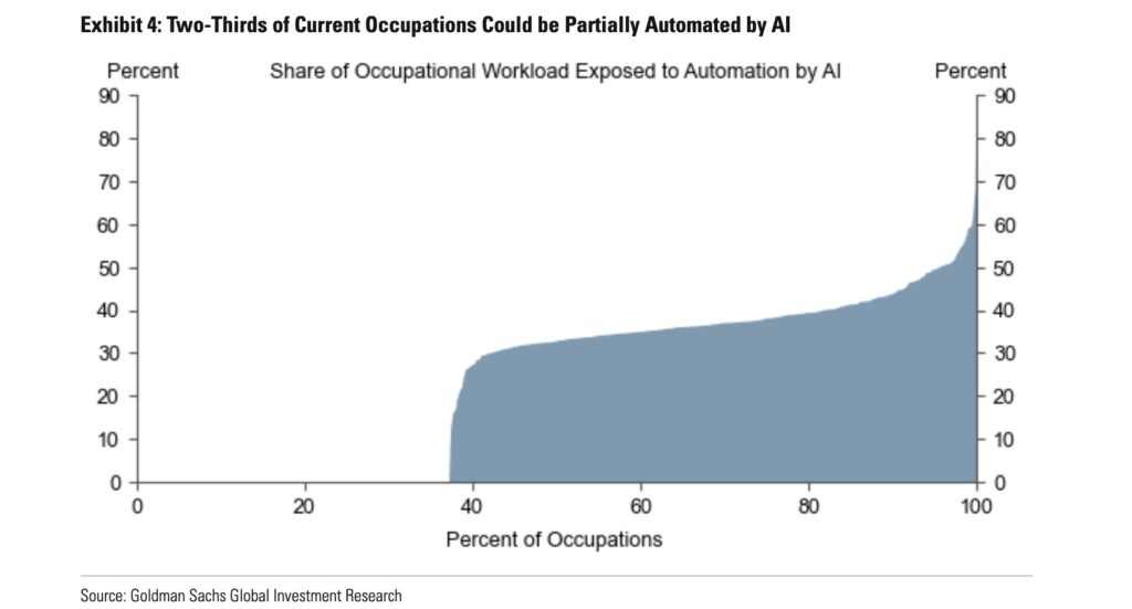 “Estrapolando le nostre stime a livello globale si evince che l’AI generativa potrebbe mettere a rischio l’equivalente di 300 milioni di posti di lavoro a tempo pieno”, scrivono gli autori.