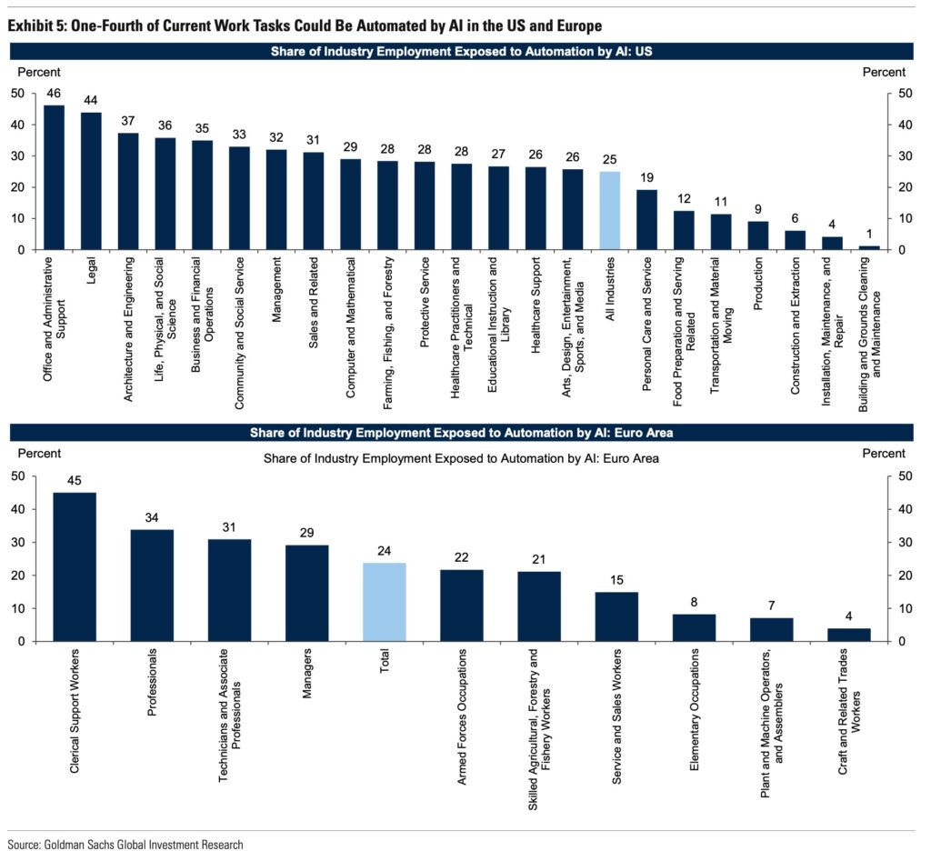 Nel lavoro di Joseph Briggs e Devesh Kodnani emerge che due professioni su tre sono esposte a vario livello all’impatto dell’AI, ma ben un quarto delle attuali mansioni lavorative potrebbe essere completamente automatizzato negli Stati Uniti. A essere particolarmente esposte alla sostituzione sono le professioni amministrative (46%) e legali (44%), mentre a rischiare meno sono le professioni ad alta intensità fisica, come l’edilizia (6%) e la manutenzione (4%). Anche in Europa le stime degli economisti giungono a conclusioni simili sia a livello aggregato che tra i vari settori.