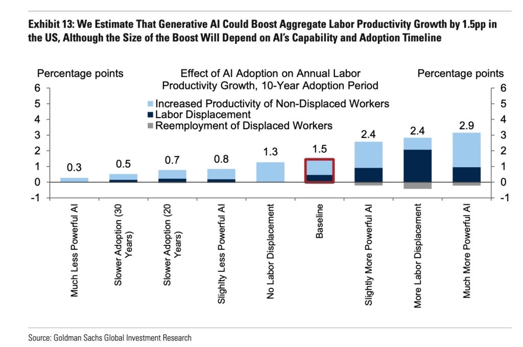 Dall’analisi tuttavia non emerge solo il dato negativo sul numero di lavoratori a rischio sostituzione. Secondo gli autori, infatti, l’adozione dell’AI generativa potrebbe aumentare il PIL globale del 7% all’anno: un valore che corrisponderebbe a circa 7 trilioni di dollari. Ma come?