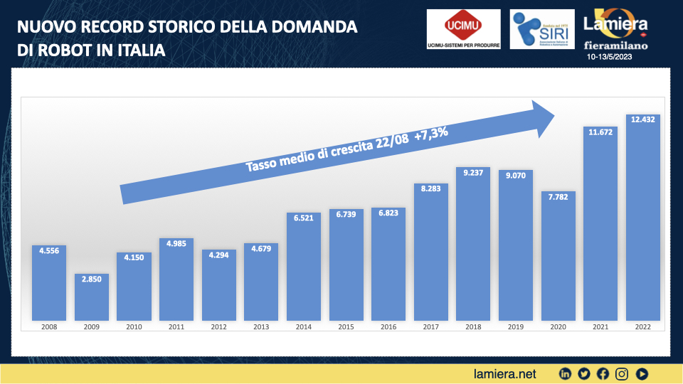 I dati presentati dal Centro Studi Ucimu – Sistemi per Produrre e Siri, l’Associazione Italiana si Robotica e Automazione, in occasione dell’edizione 2023 della fiera Lamiera confermano il trend di crescita che è iniziato nel 2013 e che ha vissuto un calo solo nel 2019 e nel 2020. Dal 2008 il tasso di crescita medio è stato infatti del 7,3% annuo, passando da 4.556 unità vendute nel 2008 a 12.432 unità vendute nel 2022.