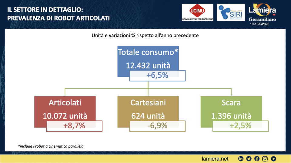 Considerando le tre macrocategorie in cui si possono dividere i robot industriali, cioè Articolati, Cartesiani e Scara, la crescita delle installazioni a riguardato soprattutto gli articolati di cui fanno parte i robot antropomorfi e che rappresentano l’81% del mercato: le vendite sono infatti aumentate dell’8,7% per un totale di 10.872 robot articolati installati.