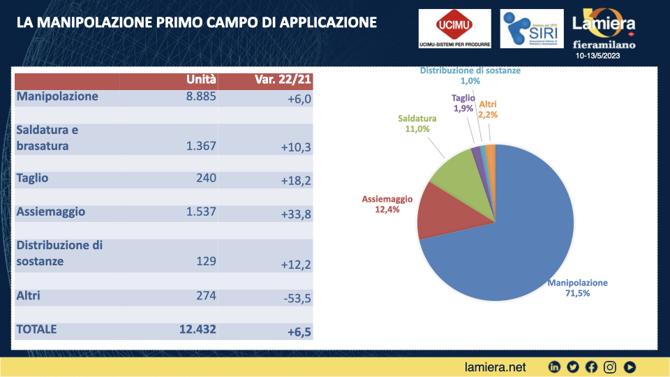 La Manipolazione, che rappresenta il principale ambito di applicazioni (qui infatti finisce il 71,5% del totale dei robot installati) cresce del 6%; l’assiemaggio diventa il secondo ambito applicativo grazie a una crescita del 33,8%; saldatura e brasatura crescono del 10,3%; il taglio cresce del 18,2%.