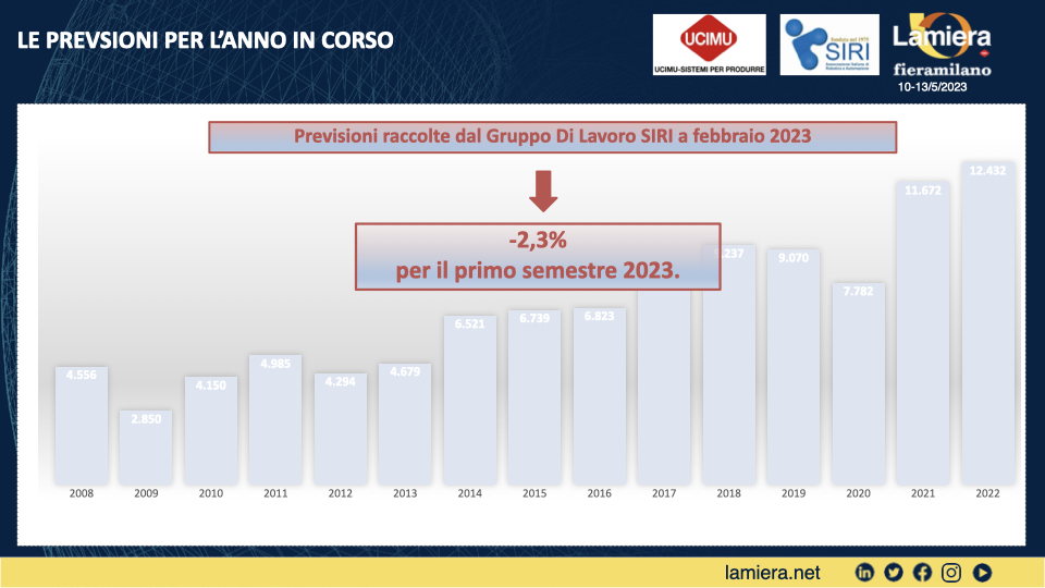 Per quanto riguarda l’anno in corso, le previsioni raccolte dal gruppo di lavoro Siri a febbraio 2023 indicano un rallentamento per il primo semestre 2023 (-2,3%).