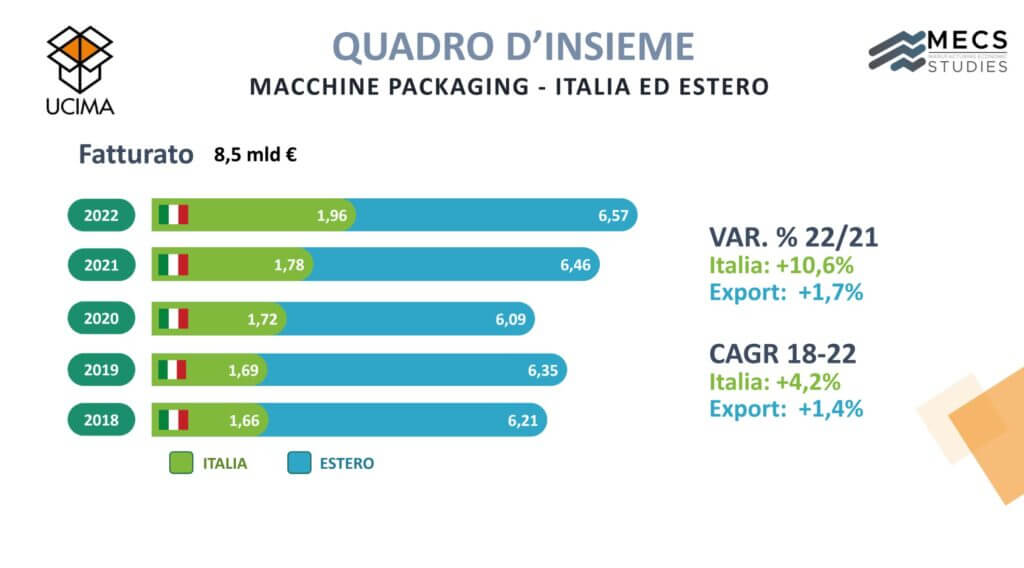 Nel dettaglio: il food risulta nel 2022 il primo settore cliente, assorbendo il 31,9% del fatturato totale coi suoi 2,72 miliardi. Il beverage si colloca al secondo posto, con il 24,8% del fatturato totale, un valore assoluto di 2,11 miliardi e una crescita di 8 punti percentuali.