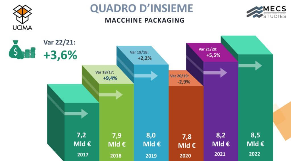 Il settore delle macchine automatiche per il confezionamento e l’imballaggio segna un nuovo record: nel 2022 infatti, il comparto ha registrato un fatturato totale pari a 8 miliardi e 537 milioni di euro, migliorando del 3,6% il precedente record del 2021: è quanto evidenzia l’undicesima indagine Ucima, che ogni anno fotografa l’andamento del comparto.