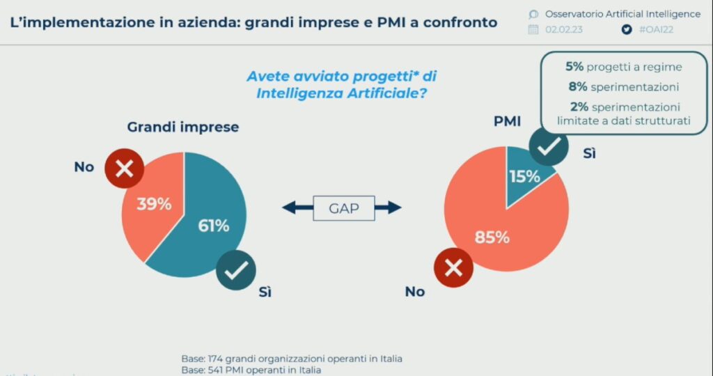 Come accade un po’ in tutto il mondo dell’innovazione, e dei suoi sviluppi, anche per quanto riguarda l’evoluzione delle soluzioni di Intelligenza artificiale si è presto creato un divario nella loro diffusione nelle grandi aziende rispetto alle PMI: secondo i dati dell’Osservatorio milanese, in Italia il 61% delle grandi imprese ha già avviato applicazioni di AI, rispetto a un ancora limitato 15% nel mondo delle piccole e medie imprese, che spesso scontano un ritardo in termini di risorse finanziarie, tecnologiche, umane.