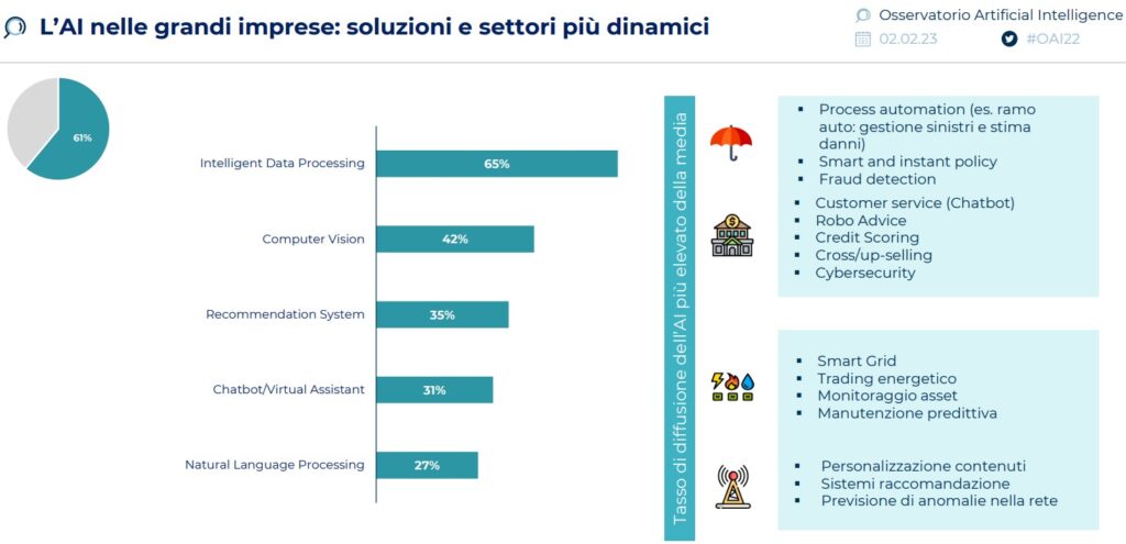 Il secondo insieme di soluzioni più adottate e più diffuse, sempre per volume di mercato, è quello del Language processing, sistemi Nlp e chatbot, che rappresenta il 28% del totale in Italia. Un settore che negli ultimi mesi a livello mondiale ha visto l’esplosione del fenomeno ChatGPT: basti pensare che nel corso del 2021 nel mondo sono stati censiti investimenti totali in sistemi di AI per 93 miliardi di dollari, e negli ultimi mesi solo per sviluppare una soluzione di Language processing come ChatGPT il colosso Microsoft ha stanziato 10 miliardi di dollari di investimenti.