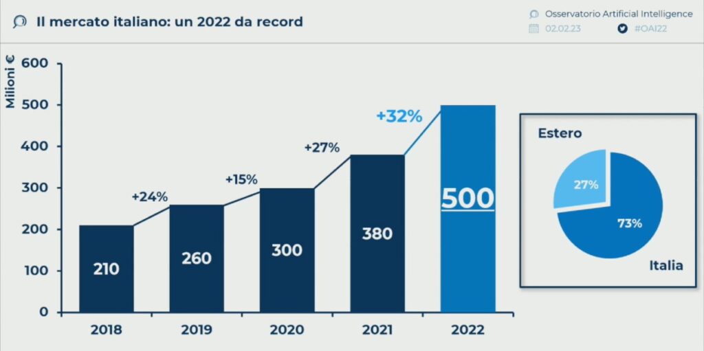 Per l’Intelligenza artificiale in Italia il 2022 è stato un anno record: il valore di mercato delle soluzioni di Artificial intelligence (AI) è arrivato a quota 500 milioni di euro, con una crescita del 32% in 12 mesi, di cui un 27% di Export.