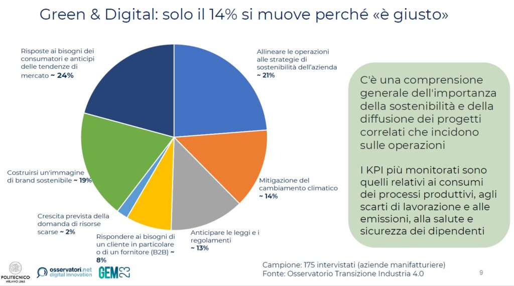 Nonostante questo, circa la metà delle aziende manifatturiere – secondo un campione di 175 imprese scandagliate dall’Osservatorio Transizione Industria 4.0 del Politecnico di Milano – ha all’attivo progetti di innovazione digitale collegati alla sostenibilità. Ma per il momento solo il 15% del totale ha già realizzato impatti e risultati concreti di sostenibilità, mentre un altro 30% di aziende ha avviato dei progetti ma i risultati attesi devono ancora arrivare, e allo stesso tempo un altro 50% delle imprese non ha ancora fatto nulla al riguardo.