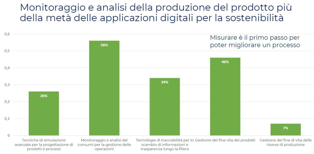 Le tecnologie più utilizzate per raggiungere gli obiettivi di maggiore sostenibilità – secondo le analisi dell’Osservatorio Transizione Industria 4.0 del Politecnico di Milano – sono l’IoT (internet of Things, per il 27% dei casi analizzati) e l’automazione avanzata e collaborativa (29%), mentre gli ambiti maggiormente impattati dalle tecnologie digitali che abilitano la sostenibilità sono il monitoraggio dei consumi delle operazioni (56% del totale) e la gestione del fine vita del prodotto (46%).
