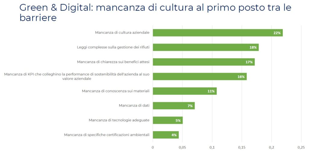 Tra gli ostacoli e le barriere maggiori che ancora frenano l’ulteriore sviluppo della sostenibilità nelle aziende e nelle filiere produttive, spiccano la mancanza di cultura aziendale (nel 22% dei casi totali), leggi ancora troppo complesse da applicare e la mancanza di KPI che colleghino le performance di sostenibilità al valore aziendale (18%). E poi, ancora: mancanza di chiarezza sui benefici attesi (17%), scarse conoscenze sui materiali (11%), mancanza di dati adeguati (7%).
