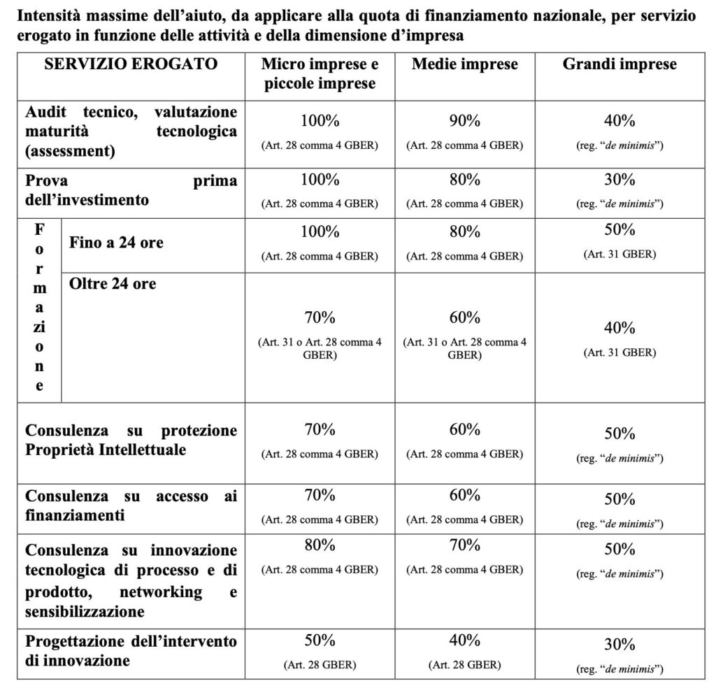 L’intensità dell’aiuto, da applicare alla quota di finanziamento nazionale, varia in relazione al servizio erogato e alla dimensione d’impresa secondo questo schema