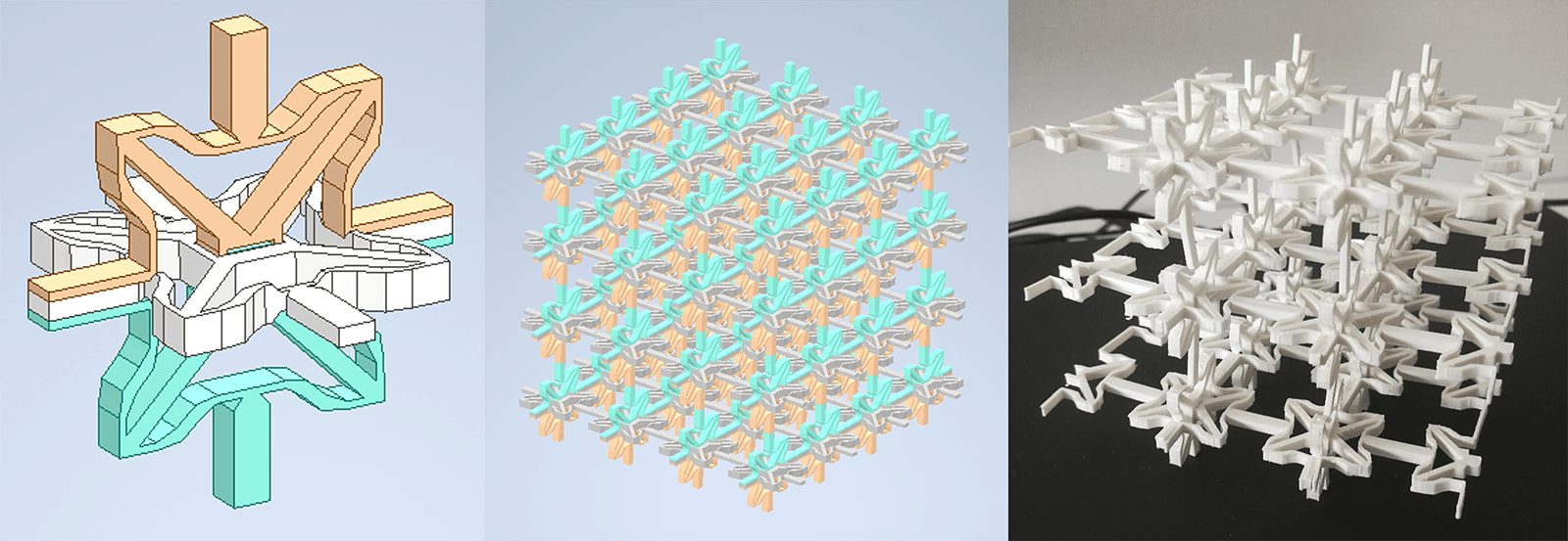 A sinistra: cella unitaria composta da elementi strutturali; al centro: Struttura materiale composta da più celle; a destra: dimostratore stampato in 3D. © Fraunhofer IWM.