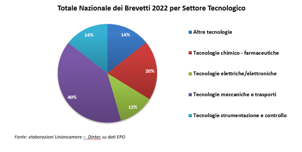 Le tecnologie della meccanica e dei mezzi di trasporto continuano a fare la parte da leone del Made in Italy: le domande di brevetto europeo in questi settori tecnologici sono 1.910 nel 2022, il 40% del totale, e crescono considerevolmente (+124 rispetto al 2021, con un aumento del 7%).