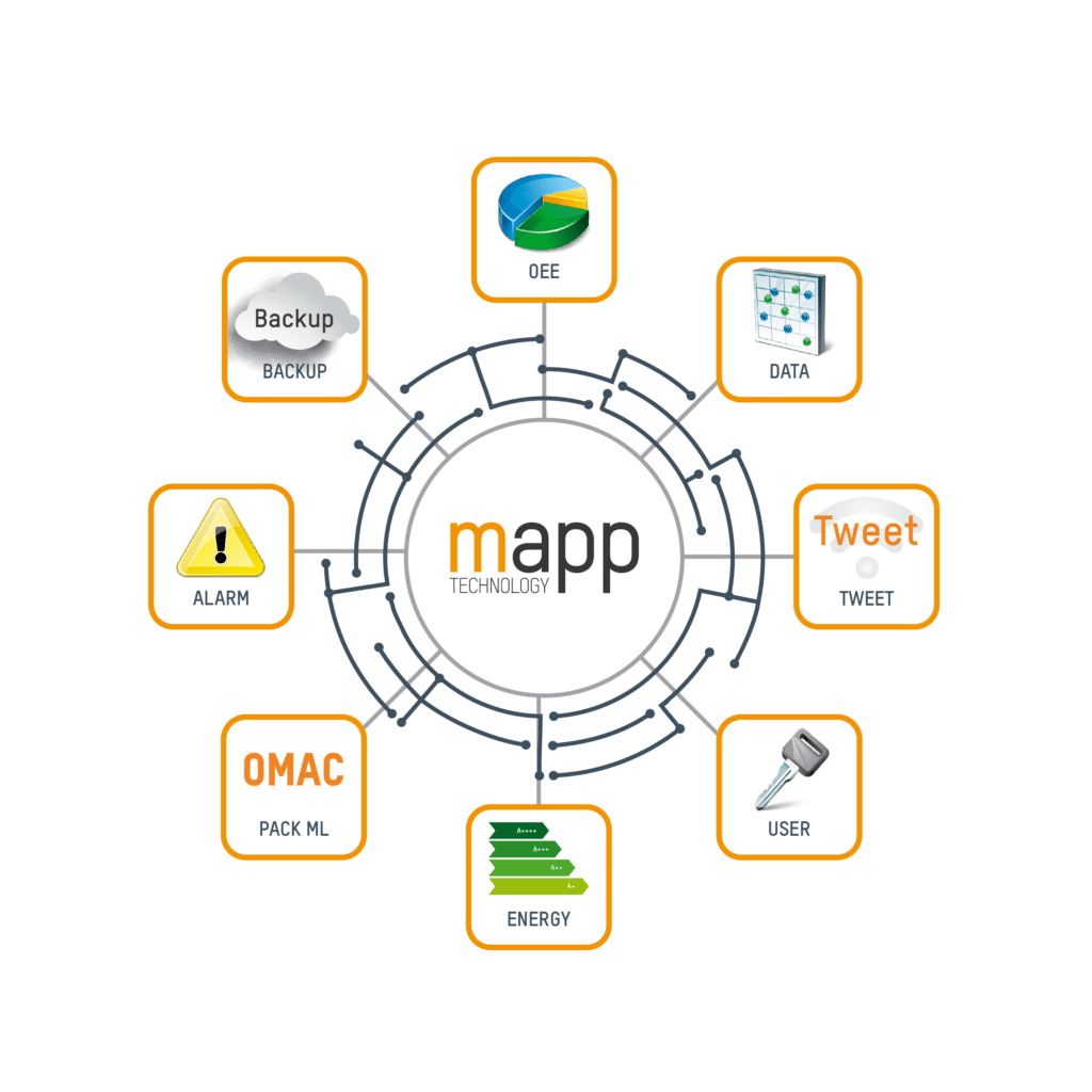I componenti software della tecnologia mapp sono pre-programmati e testati a fondo, per questo pronti all’uso con poche configurazioni da parte dello sviluppatore. Gli eventi raccolti possono essere visualizzati in un’applicazione HMI ed esportati in un supporto di memorizzazione come file di testo, PDF e/o altri formati a scelta dell’utente grazie anche a mapp Report.