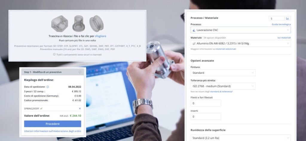 Il nostro marketplace digitale offre un’ampia gamma di processi produttivi tra cui stampa 3D, lavorazione CNC, lavorazione della lamiera, stampaggio a iniezione e pressofusione.