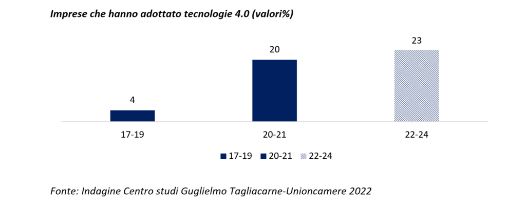 Le imprese agricole accelerano il passo per recuperare il ritardo nel cammino verso la transizione digitale. Il 23% delle aziende del settore sta adottando o intende adottare tecnologie 4.0 tra il 2022 e il 2024, contro il 4% del triennio 2017-2019 e il successivo balzo al 20% nel biennio dell’emergenza pandemica.