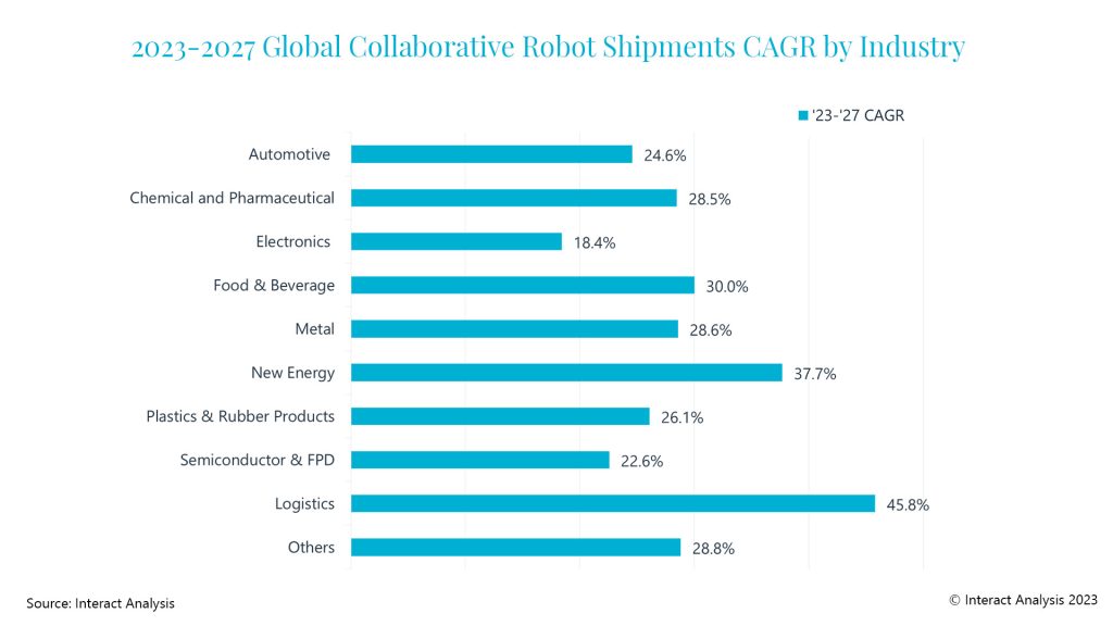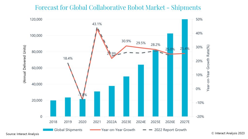 Secondo le previsioni di Interact Analysis, infatti, le consegne globali di robot collaborativi continueranno a crescere nei prossimi cinque anni con un tasso di crescita annuale composto (CAGR) del 27%.